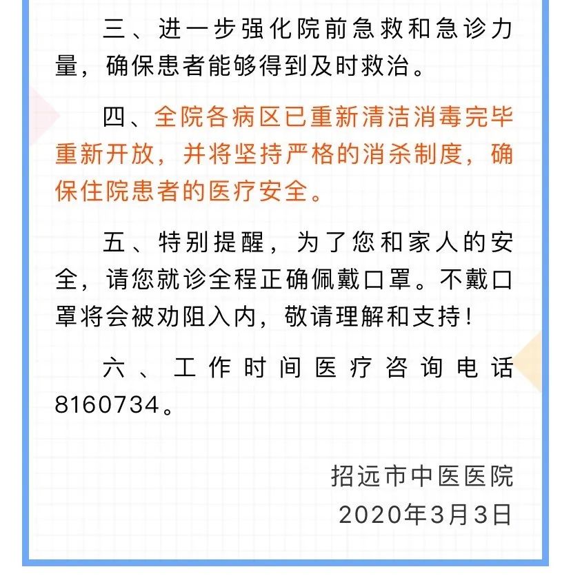 即日起,招遠中醫(yī)院各門診、病區(qū)全部正常開放!