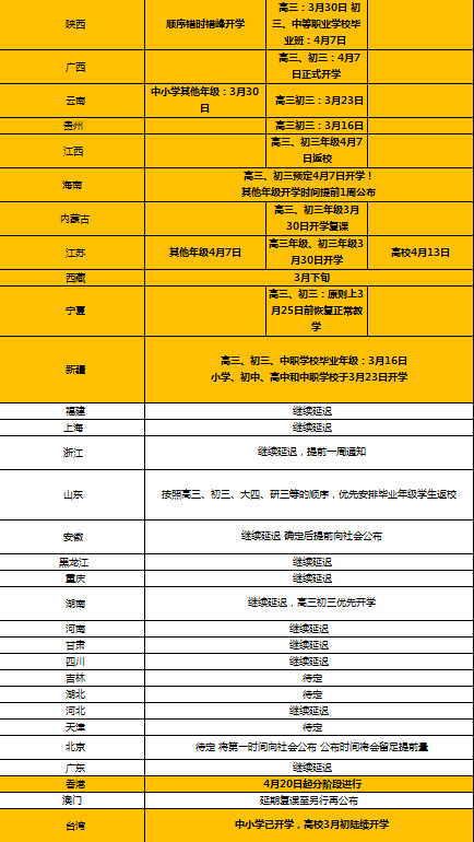 山西:高三年級按3月25日做開學(xué)準(zhǔn)備;初三年級按照4月25日開學(xué)做準(zhǔn)備;高校應(yīng)屆畢業(yè)生按4月初進(jìn)行開學(xué)準(zhǔn)備。