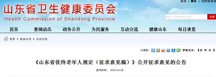 2019年10月,山東省衛(wèi)生健康委員會(huì)發(fā)布公告,向社會(huì)公開(kāi)征求對(duì)《山東省優(yōu)待老年人規(guī)定(征求意見(jiàn)稿)》(以下稱“征求意見(jiàn)稿”)的意見(jiàn)。