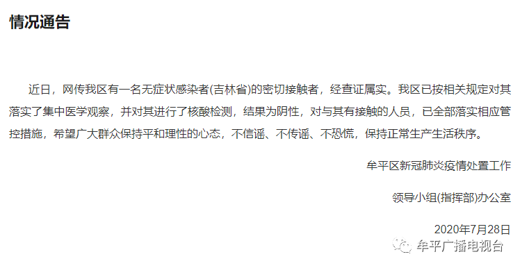 近日,網(wǎng)傳牟平區(qū)有一名無癥狀感染者(吉林省)的密切接觸者,經(jīng)查證屬實(shí)。牟平區(qū)已按相關(guān)規(guī)定對其落實(shí)了集中醫(yī)學(xué)觀察,并對其進(jìn)行了核酸檢測,結(jié)果為陰性,對與其有接觸的人員,已全部落實(shí)相應(yīng)管控措施。
