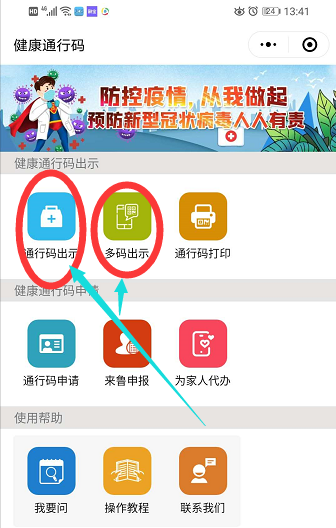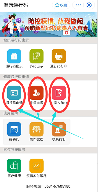 第二步 點(diǎn)擊防疫專(zhuān)區(qū)—健康通行卡,根據(jù)個(gè)人情況點(diǎn)擊通行碼申請(qǐng)(或來(lái)魯申請(qǐng)或?yàn)榧胰舜k)。