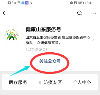 第一步 微信掃碼關(guān)注“健康山東服務(wù)號(hào)”微信公眾號(hào)。