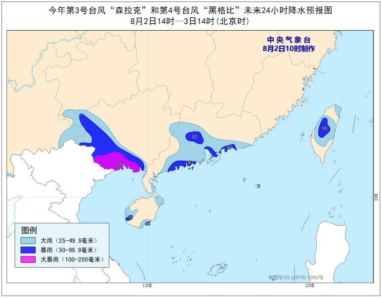 黑格比的降雨主要影響時(shí)段在明天,臺(tái)風(fēng)登陸后風(fēng)雨影響會(huì)迅速減弱。受森拉克和黑格比共同影響,預(yù)計(jì)8月2日14時(shí)至3日14時(shí),海南島南部、廣東中南部、廣西南部和西部、云南東南部、臺(tái)灣島中部等地的部分地區(qū)有大雨或暴雨,其中,廣西南部的部分地區(qū)有大暴雨(100-200毫米)。