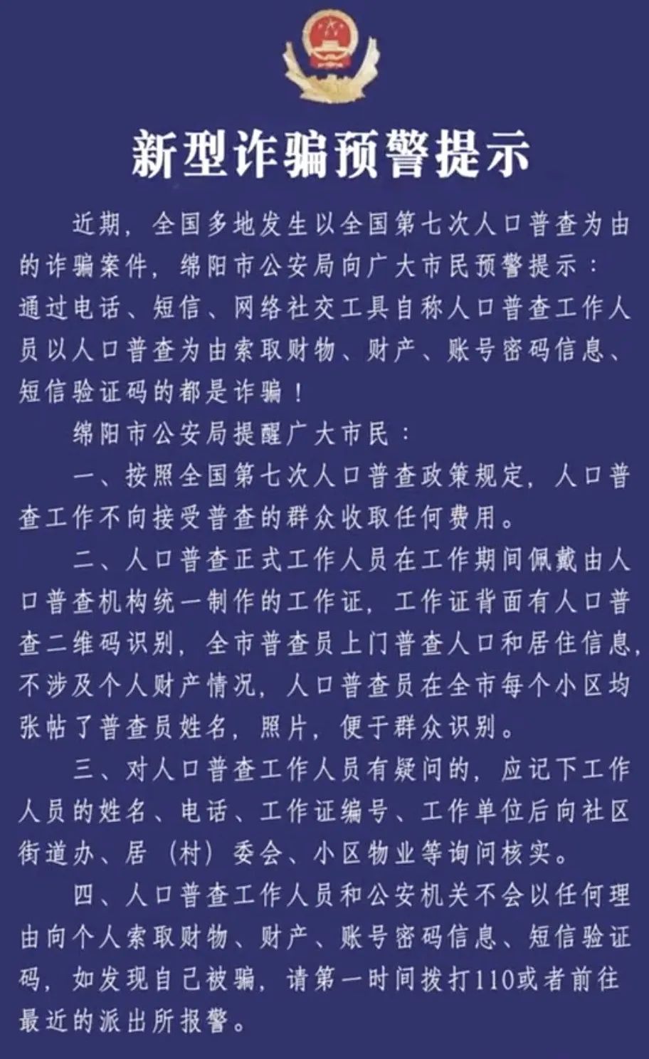 近期,全國多地發(fā)生以全國第七次人口普查為由的詐騙案件,公安預警提示,人口普查不收取任何費用,通過電話、短信、網(wǎng)絡社交工具自稱人口普查工作人員以人口普查為由索取財物、財產(chǎn)、賬號密碼信息、短信驗證碼的都是詐騙!