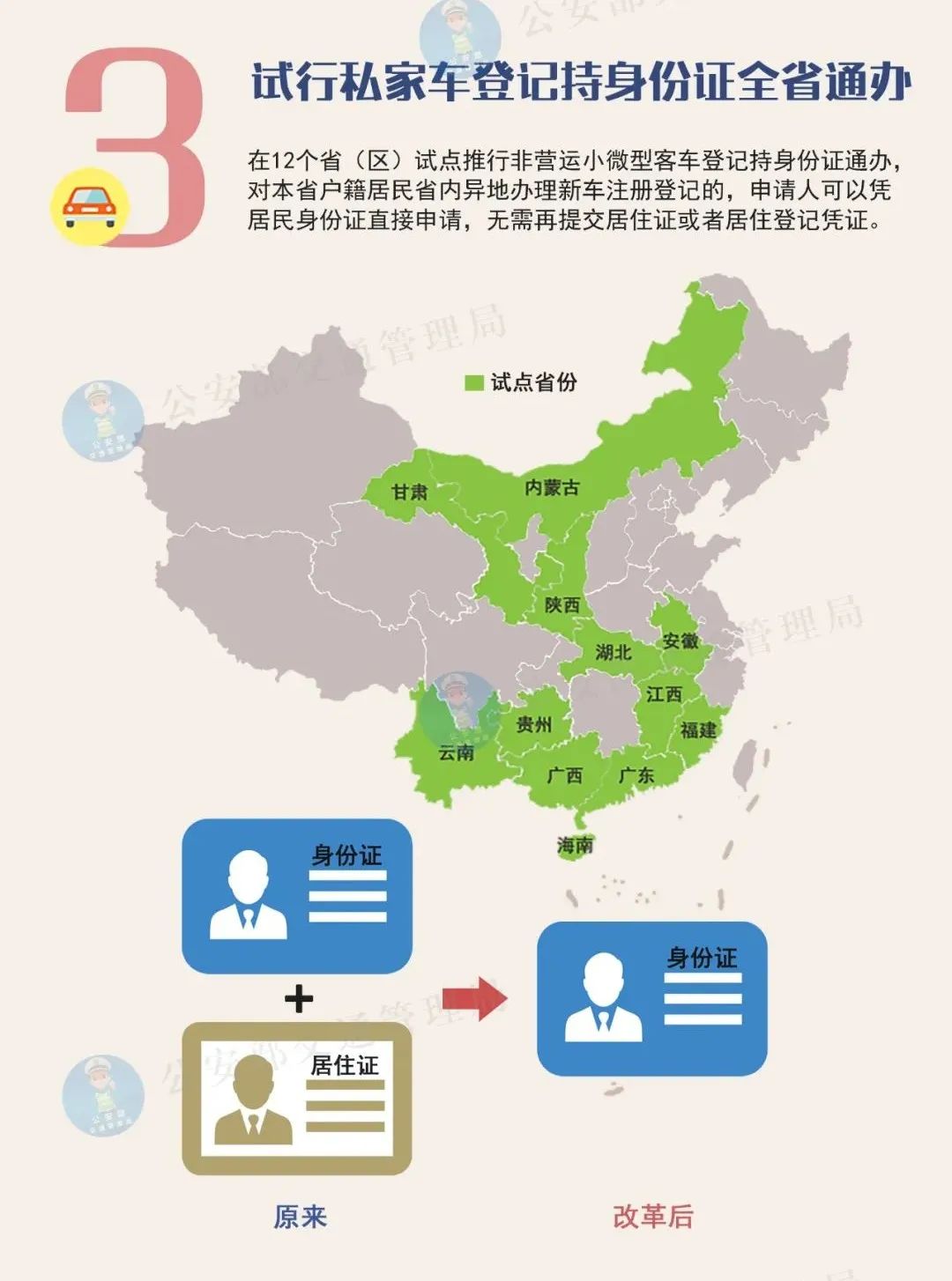 在12個(gè)省(區(qū))試點(diǎn)推行非營(yíng)運(yùn)小微型客車登記持身份證通辦,對(duì)本省戶籍居民省內(nèi)異地辦理新車注冊(cè)登記的,申請(qǐng)人可以憑居民身份證直接申請(qǐng),無(wú)需再提交居住證或者居住登記憑證。