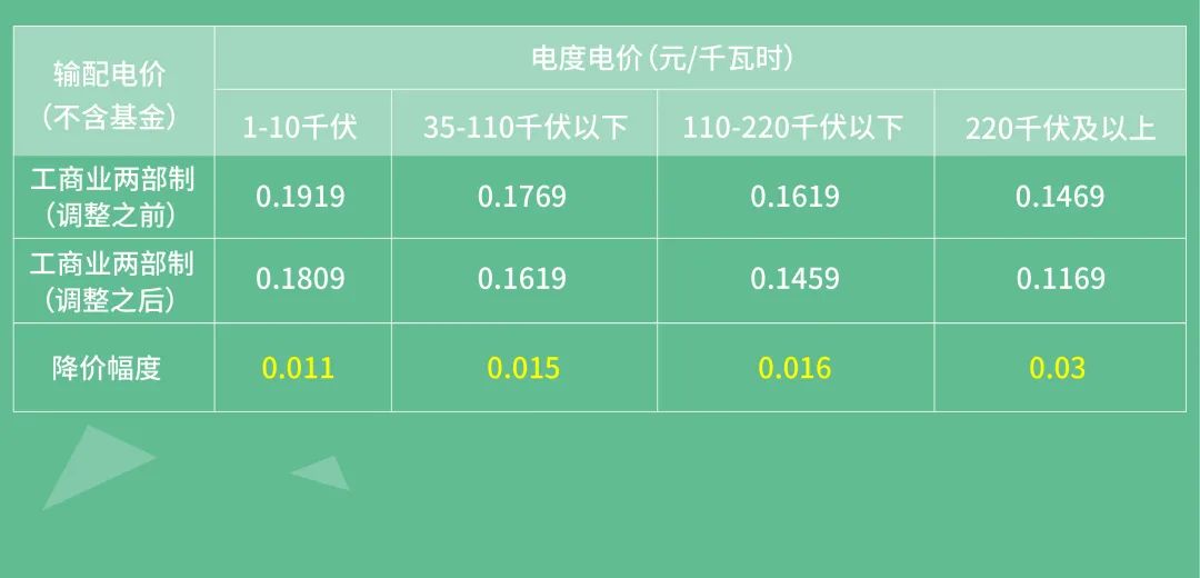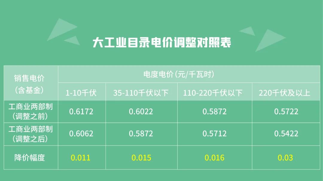 自2021年1月1日起,執(zhí)行兩部制電價(jià)的工商業(yè)及其他用電的客戶,電壓等級1-10千伏,每千瓦時(shí)降低1.1分;35-110千伏以下,每千瓦時(shí)降低1.5分;110-220千伏以下,每千瓦時(shí)降低1.6分;220千伏及以上,每千瓦時(shí)降低3分。