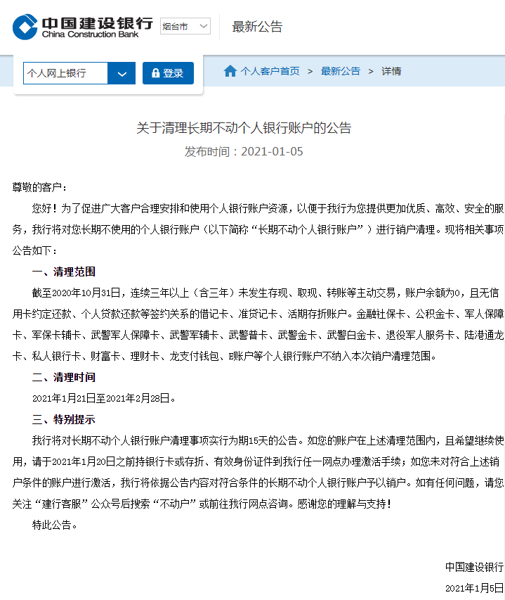 將于2021年1月8日起,對賬戶余額低于10元人民幣(含)以下,以及截止每年10月底,賬戶連續(xù)兩年(含)以上未發(fā)生任何非結(jié)息交易的個(gè)人結(jié)算賬戶展開清理工作。同一客戶在中信銀行持有一百個(gè)及以上正常或未激活的個(gè)人結(jié)算賬戶也將被限制交易。后續(xù),該行將于每年第四季度(含2021年)對滿足以上標(biāo)準(zhǔn)的賬戶進(jìn)行清理,限制賬戶交易功能。