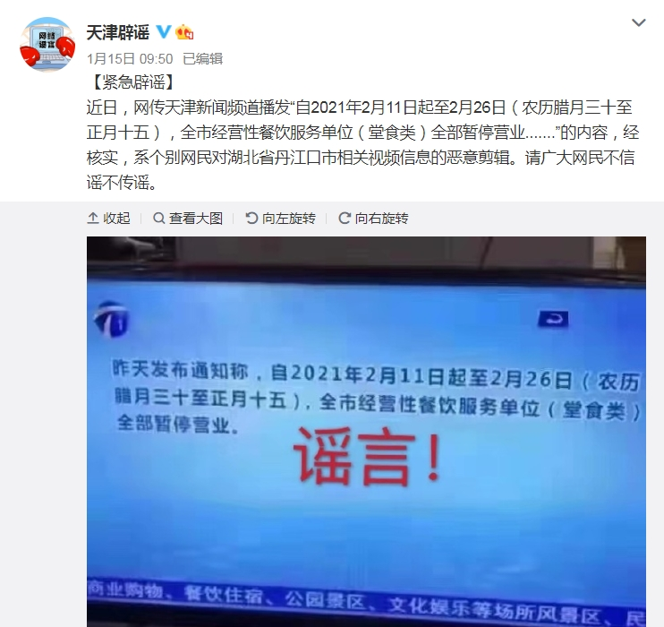 謠言:近日,網(wǎng)上熱傳一則“2021年餐飲停業(yè)通知”,稱“疫情中高風險地區(qū)餐飲業(yè)會停業(yè)”。網(wǎng)傳消息稱,沈陽、大連、北京、石家莊等地的餐廳已經(jīng)停業(yè)了。辟謠:首先,沈陽政府召開第十五場發(fā)布會時,公開強調(diào)“重點管控區(qū)域內(nèi),170余家超市、200余戶餐飲店、50余家藥房正常營業(yè)?!?/span>其次,有記者致電沈陽、大連、北京、石家莊4地12345熱線求證。得到的回答是:雖然目前處于管控期間,但政府沒有要求餐廳停業(yè),建議市民多點外賣,少聚集在餐廳吃飯。最后,天津市、山東菏澤市、大慶市也發(fā)布了相關(guān)辟謠信息。由此可見,“疫情中高風險地區(qū)餐飲業(yè)停業(yè)”的傳言不實。