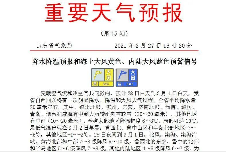 山東省氣象臺(tái)于2021年2月28日06時(shí)00分繼續(xù)發(fā)布內(nèi)陸大風(fēng)藍(lán)色預(yù)警信號(hào)↓↓今天夜間到明天,受冷空氣影響,我省將出現(xiàn)大風(fēng)降溫天氣。北風(fēng),魯西北的東部、魯中的北部和半島地區(qū)5~6級(jí)陣風(fēng)7~8級(jí),其他地