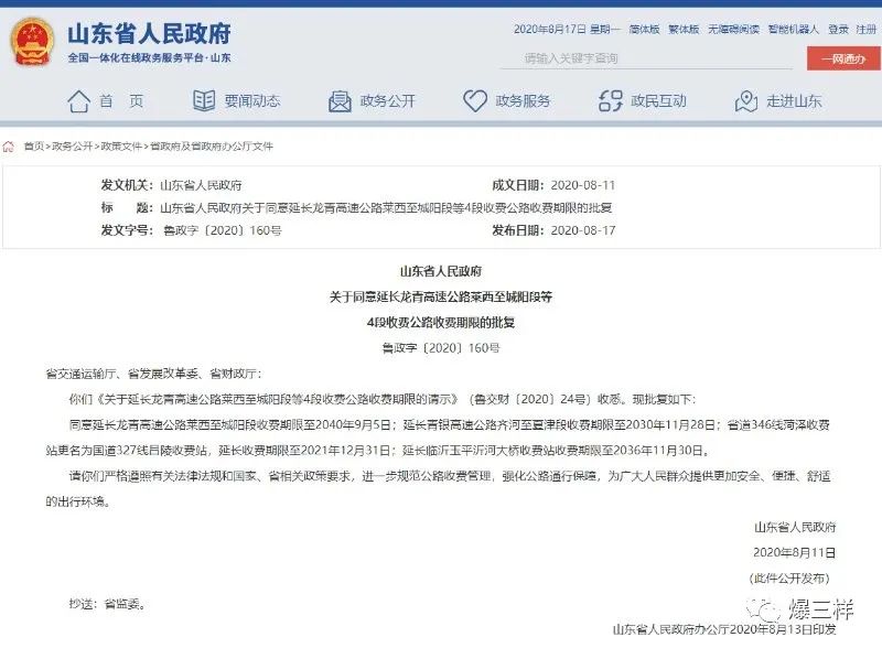全宇宙只有不到1%的人點(diǎn)擊上方進(jìn)入招遠(yuǎn)信息港你真是個(gè)特別的人8月17日,山東省政府網(wǎng)站發(fā)布《關(guān)于同意延長(zhǎng)龍青高速公路萊西至城陽(yáng)段等4段收費(fèi)公路收費(fèi)期限的批復(fù)》。批復(fù)明確,龍青高速公路萊西至城陽(yáng)段等4段